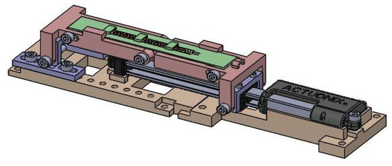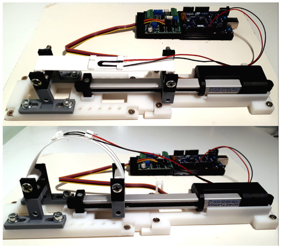 The structural and complementary parts of the test bench designed have been printed with different materials: TPU for flexible components and PETG and ABS for rigid parts. The base and the actuation part of the system is common to the two different cases of employment. The used actuator is a 12 V, T16-P Miniature Track by Actuonix, with conversion of the motion from rotary to linear by means of a ball screw. It has a stroke of 100 mm, gear ratio of 22:1, maximum speed of 46 mm/s, maximum force of 50 N and is rated force of 25 N. The motor inside the linear actuator is a rotary direct current motor and a planetary gearbox transforms the rotary motion into linear motion. The actuator is mounted on a base, made of ABS, that allows it to be centred and fixed, thus preventing the actuator from moving during the characterization. For the characterization of sensors used with variable radius of curvature, the sensor is positioned on a flexible lamina, connected at one end to a mobile support. This support can slide between two guides and, after the lamina positioning, it is fixed to the base by bolts. The other side of the lamina is fixed to a support screwed onto the motor slider. This mechanism is useful to characterize the sensor starting from the initial position of the actuator and it also allows larger foils and sensors to be mounted on the test bench. The lamina is made in TPU; this solution is adequate because, in the post-production phase, the flexibility of the TPU components was tested and found to be flexible and bendable, perfectly meeting the needs of the application. The connection between lamina and supports is obtained through the coupling of cylindrical through holes at the ends of the foil with screws on the support to obtain the bending of the sheet as naturally as possible. On the lamina upper surface, three small slots have been obtained, inside which the flexion sensor can slide to be positioned (Figure 3) and, therefore, fixed to the foil, so that it can be characterized. With this fixing, the sensor is resting on the foil and is not rigidly connected to it; therefore, it is free to move along the bending direction but is constrained not to move in the other directions, so that only its deformation is not limited. Different shapes and positions of the slots may be easily obtained with 3D printing to adapt the lamina to different sensors shapes (as shown in Figure 3). The lamina material and thickness have been appropriately chosen, so as to obtain a bending as independent as possible from the physical characteristics of the sensor, therefore allowing a curvature that does not vary with the characterized sensor.