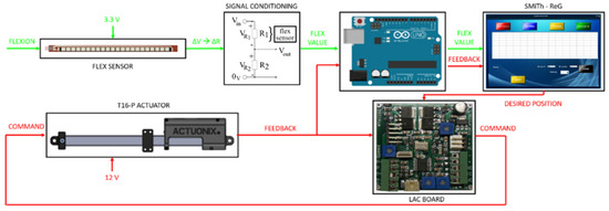 The linear actuator chosen for the test bench has no internal control, but it is equipped with a position sensor which provides an analog position feedback signal that can be fed into an external controller. It is furthermore equipped with a stand-alone, closed-loop control board (Linear Actuator Control Board, LAC) that can be used to control the actuator and which allows speed, sensitivity and stroke adjustments. The position transducer is a linear potentiometer. The effective resolution after ADC is 0.09 mm. The feedback linearity is less than 2% and the declared repeatability is ±0.4 mm. The sensitivity or accuracy of the actuator control algorithm can be set by adjusting the “Accuracy” trim potentiometer on the LAC board. A final value of 0.033 V/mm was settled. The LAC board can be used as a controller in different configurations. The most suitable in this application is the RC Servo Interface Mode (Figure 12): it is a standard hobby-type remote-control digital servo interface compatible with servo motors.