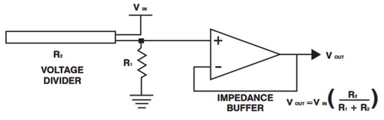 The considered flexion sensors are of the resistive type, i.e., they have an internal resistance that varies when they are bent (flexion sensor) or deformed (strain sensor). In order to read this internal resistance variation, it is necessary to use a circuit in which the sensor acts as a voltage divider (Figure 10 and Figure 11). Figure 10 shows the basic flex sensor circuit, as reported on the sensor datasheets. The impedance buffer is a single sided operational amplifier, used with these sensors because the low bias current of the operational amplifier (as LM358 or LM324) reduces error due to source impedance of the flex sensor as voltage divider. As further stated in the datasheet, it is possible to adopt a simpler circuit, skipping the operational amplifier; this is the solution adopted (Figure 11). The circuit has been built using a known resistance and an input voltage of 3.3 V.