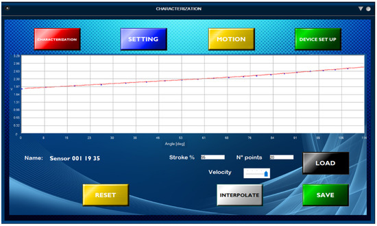 When the actuator has finished moving, the “START” button appears and the characterization begins. The user can choose the stroke of the actuator, the number of points at which it stops and acquires sensor flexion and the speed of movement of the actuator. When “START” is pressed, the actuator starts moving and stops at the first point long enough for the sensor to stabilize. Then, the sensor flexion data and motor position feedback are provided to POWER-KI by Arduino via the serial port and the real-time graph is updated with the new point recorded. At any time, the user can press the “STOP” button. In this case, the actuator stops: it is necessary to start the characterization from scratch by pressing the “RESET” button, and the graph is deleted. When the actuator has completed the characterization, it is possible to save the data by pressing the “SAVE” button: a window is opened that allows the name of the sensor that has been characterized to be entered. When the “CONFIRM” button is pressed, the characterization parameters (stroke and number of points) and the data collected are saved in a SENS type text document and named with the chosen name of the sensor. It is also possible to interpolate the various collected points and draw the interpolating function on the graph by pressing the “INTERPOLATE” button.