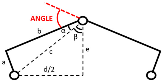 Knowing the dimensions of the designed test bench and the position of the actuator (d), the angle of interest can be calculated (Figure 14 and Figure 15) as follows.
