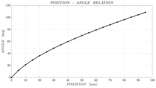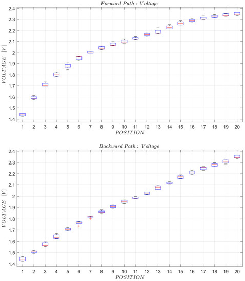 This paragraph reports and analyses the results of experimental tests carried out on commercial flexion sensors to verify the test bench adequacy and to evaluate its performance. The tests were executed with the test bench configuration for fixed radius of curvature. Although both the configurations of the device could and should be tested for a complete evaluation on the system performance, tests were executed in this first campaign with the test bench configuration for fixed radius of curvature. This allowed for a preliminary evaluation of the main device characteristics under simplified conditions, since data are comparable per se. The motor was connected to the LAC board and to Arduino for control and data collection, which was done using the POWER-KI software. Tests were carried out using five commercial flex sensor 2.2 in length produced by Spectra Symbol. Each test involved an actuator stroke of 95 mm (maximum possible stroke 100 mm), the collection of sensor resistance data and motor position feedback at 20 points (including the extremes at 0 mm and 95 mm positions) and a stop time between one motor movement and the next of 3 s to allow the actuator and sensor to stabilize. The measurements were taken at the end of this pause time and are the average value of 10 repetitions, in order to improve the accuracy of the performed tests. The measurements were performed in both the forward and the backward path for a total of five proofs for each sensor. The data saved during each measure are the actuator position feedback, which is read by a potentiometer inside the motor and the resistance value of the sensor. Both values are given as input to the Arduino as a voltage and are reported in a range of 0–1023. In particular, the calculation of the resistance change of the sensor is done by means of a voltage divider, using a known resistance and an input voltage of 3.3 V. In this case, the voltage on the sensor that is read by the Arduino is:
