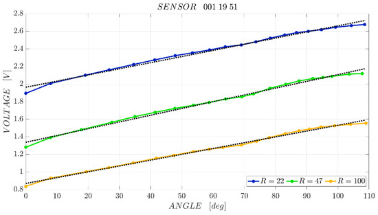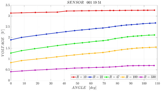 The choice of the best resistor to use within the circuit for monitoring the sensor movement is based on the comparison of the obtained characteristic curves in terms of sensitivity. To carry out this analysis, for each curve, the output range for the measuring range of interest (i.e., the difference between the highest and lowest values) and the slope of the linear regression line calculated by the method of least squares were compared, in order to find the resistance that gives the sensor the best sensitivity (as in [49]).