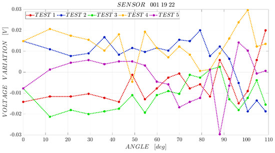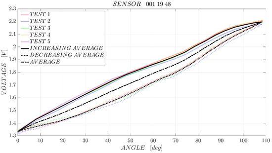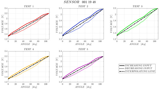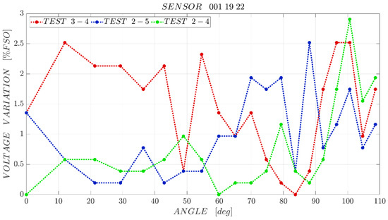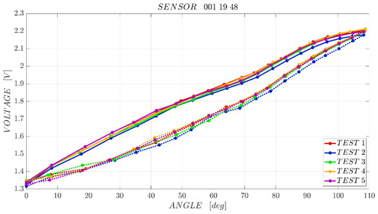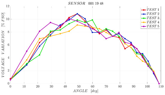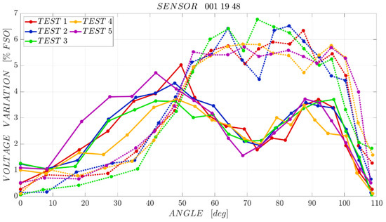 The maximum difference between the forward and backward paths of the characterization is obtained in the central part of the curves, for bending angles of approximately 40–60°. For sensors “001 19 28”, “001 19 48”, “001 19 51” the sensor/test bench hysteresis is around 11–12% of the full scale output. Sensor “001 19 22” has a similar behaviour, but in test 3 the hysteresis is close to 13% FSO, whereas with sensor “001 19 35” the lowest hysteresis is achieved: 8.5% FSO.