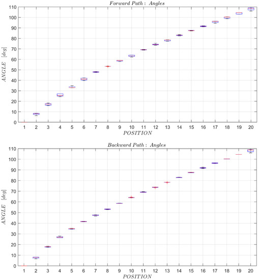 The null hypothesis of the t-tests to compare the angle mean values between the forward and backward path in each position was verified in most cases; in fact, it is not verified only in 12 positions out of 100. The p-values are quite good, and overall it can be said that the device movement does not have a significant hysteresis between the forward and backward path.