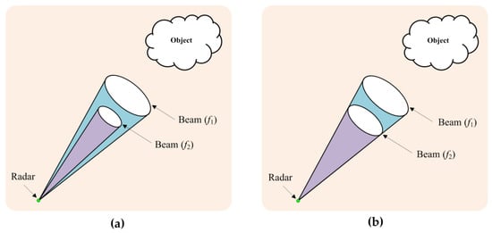 Dual-band radar emitting two independent beams: (a) Unequal beamwidth in two frequency bands; (b) Equal beamwdith in two frequency bands. Atmospheric particles, such as clouds, snow, and rain, are the typical detected objects.