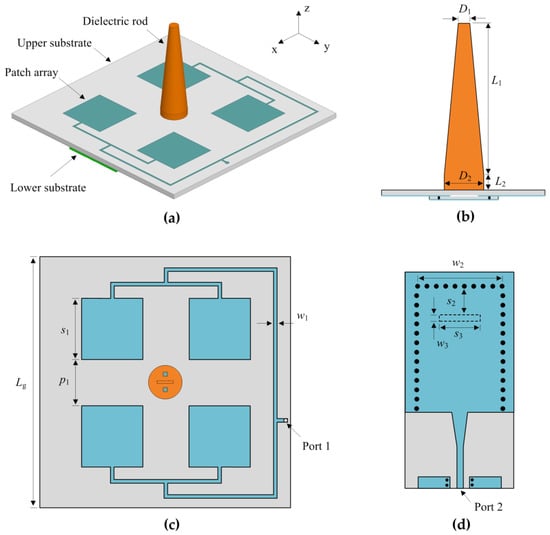 To obtain medium gain (i.e., 10–20 dBi) performance in two frequency bands, a hybrid antenna structure is proposed. As shown in Figure 2, it combines a patch array and a dielectric rod antenna. The patch array and its feed network are printed on the top layer of the upper substrate. The dielectric rod is located at the center and is fed by a SIW feed network. The SIW structure is fabricated on the lower substrate. A slot is etched on the ground plane to couple energy from the SIW feeder to the dielectric rod. Two parasitic metallic pins are placed in the upper substrate, which is beneath the rod. A tapered transition is printed at the bottom layer of the lower substrate to transform the input impedance of the SIW feeder to 50 Ω. The detailed dimensions are listed in Table 1.