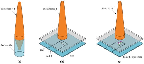 Design evolution of the feeding network for dielectric rod antenna: (a) Using a conventional 3-D waveguide feed; (b) Using a planar SIW feed; (c) Using a planar SIW feed with a pair of parasitic monopoles.
