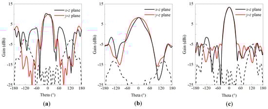 The simulated radiation patterns with parasitic monopoles and dielectric rods are shown in Figure 4c. The main beamwidth in the x-z and y-z planes agrees well. The peak gain is 13.4 dBi in the zenith direction, and the 3-dB beamwidth in the x-z and y-z planes is 34.7° and 35.8°. The two values are almost equal, indicating that a pencil beam is obtained. Therefore, the distortion of the radiation patterns can be well amended.