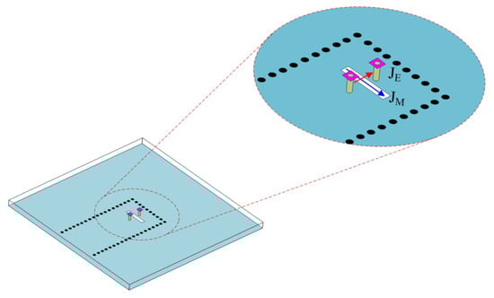 The operating principle of the feed network is further analyzed to explain the amendment of the radiation patterns. As depicted in Figure 5, the feed network is considered to be a ME dipole. On the one hand, the length of the slot is about half-wavelength. The slot serves as a magnetic dipole. The direction of magnetic current JM is transversal with respect to the slot. On the other hand, the length of the parasitic monopoles is about quarter-wavelength. The currents on the two monopoles are out of phase since the monopoles are located at the two sides of the slot. Therefore, the two monopoles serve as an electric dipole. The direction of equivalent current JE is also transversal with respect to the slot. The ME dipole is constructed based on the slot and the monopoles. As we know, the ME dipole has symmetrical radiation patterns in E- and H-planes []. The pencil beam remains unchanged when a dielectric rod is placed above the ME dipole because the dielectric rod can also emit a pencil beam.