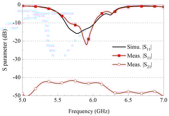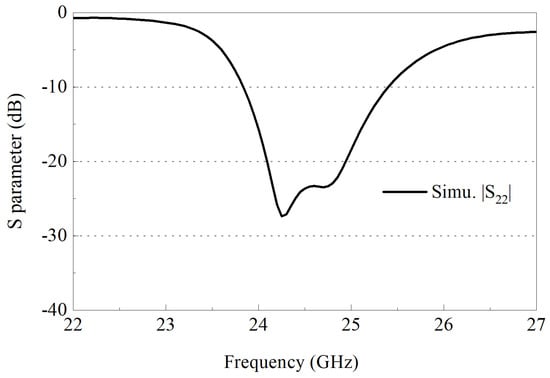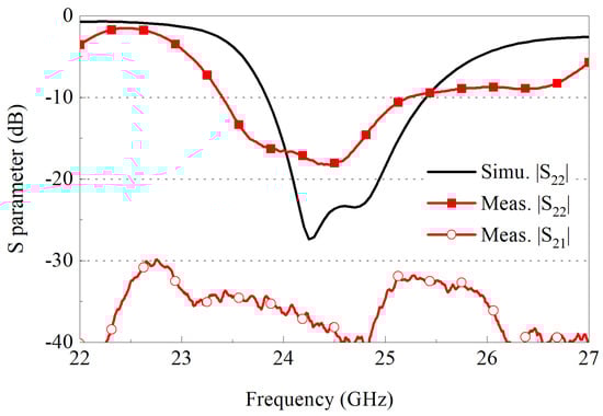 Figure 12 and Figure 13 show the S parameters in the lower and upper bands, respectively. The simulated and measured curves of |S11| agree well in the lower band. The measured −10 dB bandwidth is 350 MHz (5.67–6.02 GHz), which is sufficient to cover the 5.725–5.875 GHz ISM band. The measured port isolation ishigher than −40 dB. In the upper band, the measured |S22| has some frequency shift from the simulated one. This difference may be attributed to fabrication errors. The measured −10 dB bandwidth is roughly 1.8 GHz, ranging from 23.4 GHz to 25.2 GHz, which can cover the 24–24.25 GHz ISM band. The measured port isolation is higher than 30 dB.