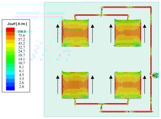 The center frequency of the patch array is designated at 5.8 GHz. Figure 9 shows the instantaneous current distribution on the patch array and the feed network. It is clearly observed that the feed network can provide four ways of signals with in-phase or out-of-phase excitations. The currents on the four patches are almost the same, which imply that the phase gradient of the patch array is zero. Therefore, a broadside radiation pattern will be generated.