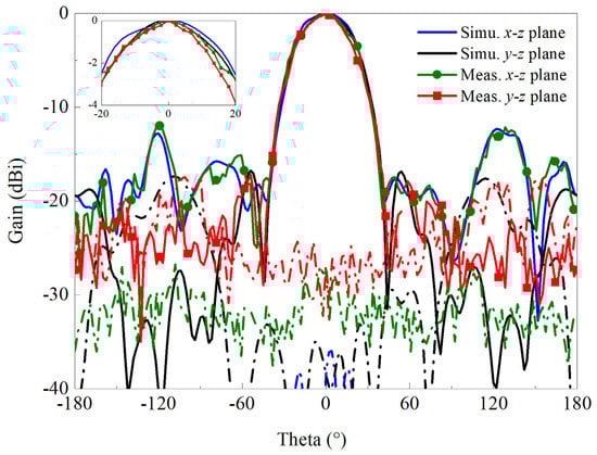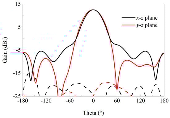 The simulated radiation patterns of the patch array are shown in Figure 10. It is observed that the peak gain is 12.7 dBi. The 3-dB beamwidth in the x-z and y-z planes is 40° and 43.6°, respectively. The two values are close, which means that the pencil beam is generated in the lower frequency band.