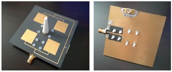 Photograph of the fabricated antenna. Left side is the top view and right side is the bottom view.