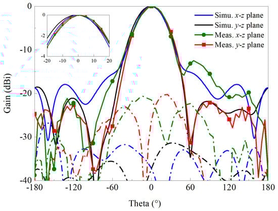 The radiation patterns at the two bands are measured in a far-field chamber. During the measurement, when one feed port is excited, the other feed port is terminated with a 50 Ω load. A total of 5.8 GHz and 24 GHz are selected to represent the typical frequency points in the lower and upper bands. Figure 14 and Figure 15 show the simulated and measured normalized radiation patterns at the two frequencies. The simulated and measured curves show reasonable agreements. Pencil beams can be observed at both 5.8 GHz and 24 GHz. At 5.8 GHz, the measured 3-dB beamwidth in the x-z and y-z planes is 42° and 43°. At 24 GHz, the 3-dB beamwidth in the two planes is 39° and 42°. These values are close. Therefore, almost equal 3-dB beamwidth is achieved in the two frequency bands. The cross-polarization levels are all below −18 dB in the two principal planes. The measured peak gain at 5.8 GHz and 24 GHz is 12.5 dBi and 12.7 dBi.