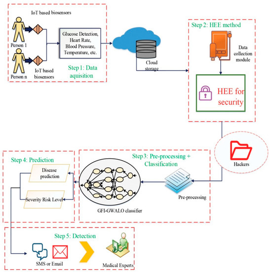 Numerous IoT-based biosensors were connected to different people. The sensors can collect the person’s glucose level in the blood, heartbeat rate, blood pressure, temperature, cholesterol, respiratory rate, etc. These collected data from the people are gathered and stored in cloud data storage. In this cloud storage system, the different types of data are collected in the cloud unit. Moreover, the affected person’s data are protected by a novel HEE security method. Here, a novel GFI-GWALO-based classification method was proposed for classifying the predicted disease and severity level of the illness.