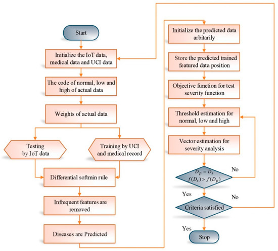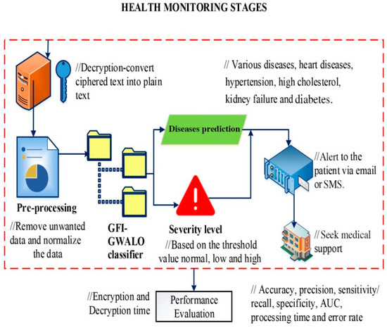 Furthermore, the IoT collects an enormous amount of data in the medical care system, and data science technology can provide an essential method to develop more intelligent IoT devices [14]. Machine learning and data mining are a branch of data science, which is used to estimate new patterns and guidelines from data [15]. The enormous amount of data from the clinical system is significantly handled by the ordinary machine learning method [16]. Traditionally, various techniques have been utilized such as classification methods, the neural network (NN) approach, fuzzy methods, heuristic techniques and clustering techniques for disease prediction [17]. However, the conventional methods have not performed efficiently [18] because, if some of the data are missing, the accuracy of the conventional methods of disease forecasting is diminished and a high error rate is produced. Moreover, [19] used a lightweight encryption replica for analyzing the biological data of the affected people using IoT devices, but these analyzed data cannot provide accurate information about the affected people. In addition, an e-health system is provided for patients to reduce health problems [20]. However, this technology requires more security to protect the collected data in an efficient manner. Some recent heuristic algorithms have been used in the field of engineering such as particle swarm optimization [21], 2-Opt-based discrete ant lion optimization technique in routing issues [22], memetic genetic approach for traveling salesmen problems [23], arithmetic optimization method [24] and so on. Therefore, in this research, hybrid intelligent secure strategies were utilized to achieve the best outcomes in terms of improved security and prediction. Moreover, the developed technique aims to predict disease in the human body with the help of IoT-enabled devices. Conventional health support methods only forecast the chance of individual diseases, and security hazards are a major problem. Thus, the main scope of this research was developing a new hybrid encryption technique to protect the sensitive data of patients from the access of attackers. Moreover, the hybridization of a novel classifier based on neuro-fuzzy and optimization was performed for enhanced disease prediction with the best accuracy. Furthermore, the main aim of this research was to predict and analyze the severity of diseases.