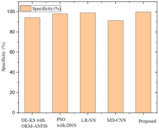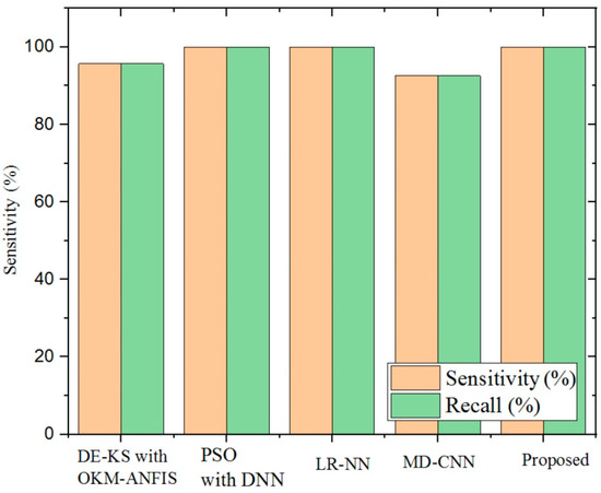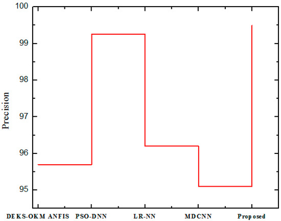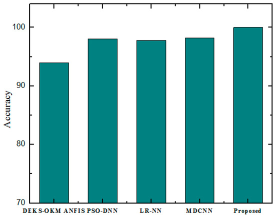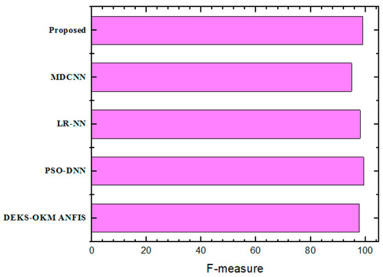 The F-measure value of the proposed HEE with GFI-GWALO (99%) is compared with the conventional DE-KS with OKM-ANFIS (97.8%), PSO with DNN (99.39%), LR-NN (98.1%) and MDCNN (95%), which is illustrated in Figure 11. This shows that the HEE with GFI-GWALO achieved a higher F-measure than existing methods and is detailed in Table 6.