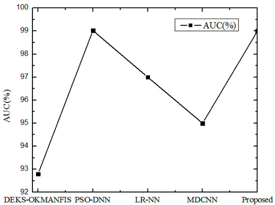 The Area of Curve (AOC) value of the proposed HEE with GFI-GWALO (99.05%) is compared with the conventional DE-KS with OKM-ANFIS (92.8%), PSO with DNN (99%), LR-NN (97%) and MDCNN (95%), which is illustrated in Figure 12.