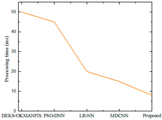 The processing time analysis is the main part of this research because a shorter processing time is more efficient than a longer time. The achieved processing time of the proposed HEE with GFI-GWALO (50 ms) is compared with the conventional DE-KS with OKM-ANFIS (45 ms), PSO with DNN (20 ms), LR-NN (96.2%) and MDCNN (15 ms), which is shown in Figure 13 and Table 8.