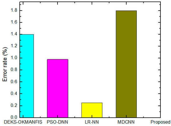 The error rate of the proposed HEE with GFI-GWALO (0%) is compared with the conventional DE-KS with OKM-ANFIS (1.40%), PSO with DNN (0.98%), LR-NN (0.25%) and MDCNN (1.8%), which is illustrated in Figure 14.
