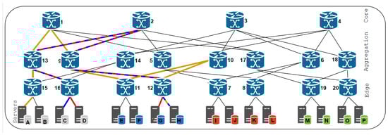 We illustrate our approach in more detail in Figure 1. We construct a topology as an example in order to analyze the performance of the two forwarding methods we propose below. There are 20 switches and 16 hosts. Assume the links have the same bandwidth, . The source and destination hosts of data flows and are , , and , , respectively. The volume of traffic injected by and are and , respectively. Assume that the flows are sent to the DCN simultaneously at . When flows arrive at 16, the FPLF algorithm checks the link utilization matrix so that it fills the active links to of their maximum utility. This percentage utilization is targeted for performance reasons between the source and the destination. Once it is exceeded we open new paths. The end result is that we keep as many links as possible in the off state. From a routing perspective, the path 16→13→2→9→12 is shared between both of and if and only if the utility of the links is under the threshold value in the link utilization matrix.