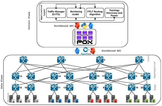The experimental platform is constructed using the Mininet network emulator [], and the POX controller which is run using Ubuntu 20.04.2 LTS 64-bit. The network topology is imported from the Fast Network Simulation Setup (FNSS) [], and the FPLF algorithm is implemented using the POX controller as POX modules. To generate network traffic from servers within a DCN, the Distributed Internet Traffic Generator (D-ITG) [] platform is used. The architecture is shown in Figure 2.