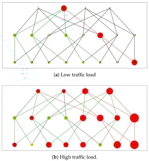 For the majority of the time, it has been reported that the DCN is in a low-load state []. The problem is that energy consumption of DCN resources, such as links, is wasteful when the utilization level is low. This is because engaging certain equipment in DCN activities, e.g., routing, does not justify the additional cost of the associated energy consumption []. Therefore, our proposed approach causes a gradual increase in the number of active links as the traffic demand increases. The opposite strategy is pursued when the traffic demand is low.