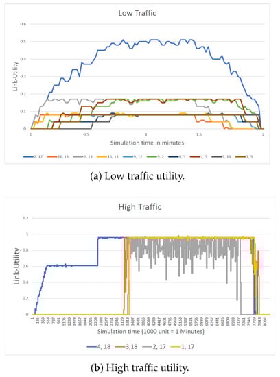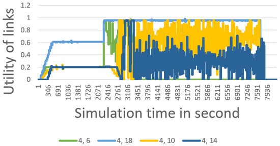 The cumulative traffic values in Figure 3a illustrate how the switches are utilized during the simulation time depending on the utility of the link. In the first scenario, the sub-path nodes have high cumulative values due to the energy-saving path returned by the FPLF algorithm. Moreover, in the second scenario because the traffic was gradually increased from low to high, Figure 3b shows different cumulative values to core switches (), corresponding to link utilization values in Figure 4b, where core switch number 4 and the download switches (i.e., switches located along the downward path) have high cumulative values. This happened because the FPLF algorithm selected an energy-saving path in the first 3 min of the simulation, and after that the algorithm started to gradually open new paths to accommodate the traffic and to meet the QoS requirement.
