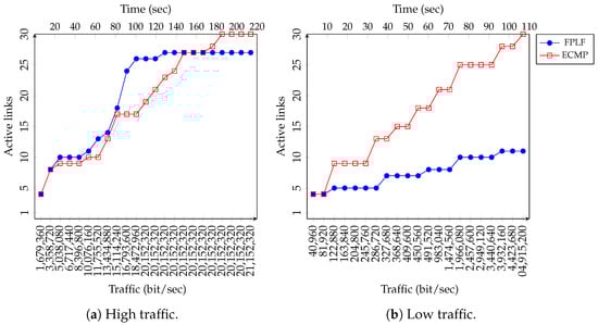 The FPLF algorithm outperformed ECMP in both cases (low and high traffic). In low traffic cases, which is illustrated in Figure 5b, the FPLF algorithm reduced the number of links by installing energy-saving paths in DCN’s switches. Intuitively, the number of utilized links and switches should increase proportionally with increasing traffic to meet QoS targets. That is what happens in Figure 5a, which illustrates the low latency of the FPLF algorithm with a sudden spiking of traffic in a short time, compared to the ECMP algorithm, to accommodate the increase in traffic. While the FPLF algorithm returns 16 paths with 27 links, ECMP in comparison returns 16 paths with 30 links. This suggests that the FPLF algorithm is more traffic-aware. Since the number of downward links from core switches is four, as shown in Figure 3, bursty high traffic from all other servers leads to these four links being filled, and adding any new upload link is useless; therefore, the algorithm settles on 27 links.
