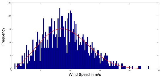 The scaling and shaping factors for Weibull PDF are that were set to = 10.5 and = 2.6. A 1000 Monte Carlo wind speed distribution scenario utilizing Weibull PDF is depicted in Figure 1.