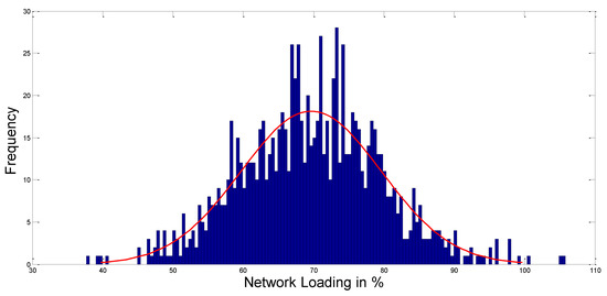 where the standard and mean deviation values are and , respectively. represents the load normal distribution’s probability density. Figure 3 shows the Monte Carlo scenarios of load demand formed with a normal distribution PDF ( = 10, = 70, and sample size = 1000).