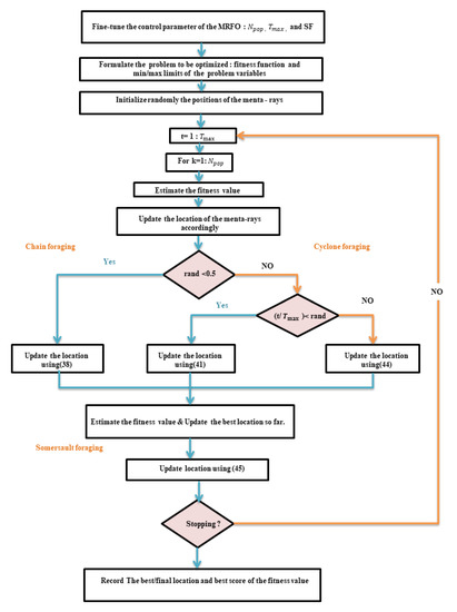 The manta ray foraging optimizer (MRFO) is a new bioinspired optimization technique which was introduced in 2020 for solving engineering applications [19]. Manta rays are aquatic animals with two pectoral fins and a flat body. They are able to swim freely, as if they were birds. They also feature a pair of vertical lobes protruding from their massive terminal jaws. They do not have sharp teeth; therefore, they eat plankton (microscopic animals) [19]. The MRFO is similar to other optimizers that are based on developing the exploration and exploitation stages. For solving distinct optimization issues, three foraging strategies, i.e., chain foraging, cyclone foraging, and somersault foraging, can be used to define the development [25,26,27]. The mathematical models of the three foraging strategies are described below.