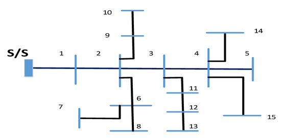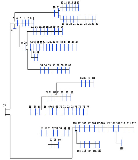 In this section, the proposed approach is utilized to find the optimal RER allocations in two RDNs while considering the system’s uncertainty. The installation of RERs is identified as a function of reducing the expected cost, the expected emissions, and the expected voltage deviation, while also improving the voltage stability index. These objectives were integrated into a single multi-objective function in order to optimize them all at once. The MRFO was used to combine a solar PV and WT-based DGs within the IEEE 118-bus and a rural 51-bus systems as real distribution networks. The IEEE-15 bus system was also modeled as a small distribution network. Figure 5, Figure 6 and Figure 7 show the single-line diagrams of these systems, respectively. The detailed parameters of the IEEE 118-bus, rural 51-bus, and the IEEE 15-bus test systems were provided in [28,29,30], respectively. Table 2 shows the initial power flow of these systems in the base case. The obtained results were compared with PSO, ALO, WOA, and SCA to verify the effectiveness of the suggested MRFO. Table 3 lists the parameters of the optimization techniques considered in this paper, whereas Table 4 lists the restrictions of the studied system, and Table 5 shows the characteristics of the generation resources. The proposed algorithms were developed using MATLAB software and applied to two case studies.
