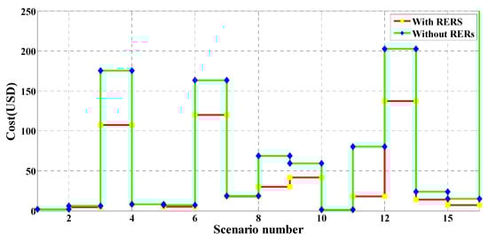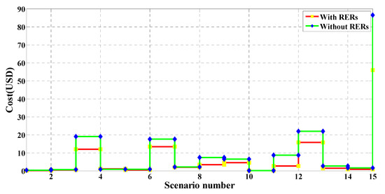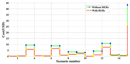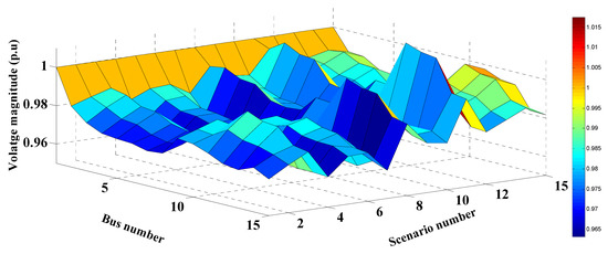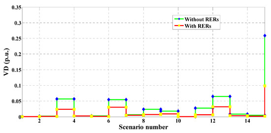 In this case study, MRFO was employed to identify the optimal RER locations and ratings within the 15-bus system shown in Figure 7. Without RERs, the expected cost, emissions, voltage deviation, and the expected voltage stability index were 88.1005 USD/h, 1,879,200 kg/MWh, 0.5313 p.u., and 12.0005 p.u., respectively. In the case of the optimal insertion of WT and solar PV-based DGs, these respective values improved to 54.8523 USD/h, 724,180 kg/MWh, 0.2211 p.u., and 13.1670 p.u., with a percentage improvement of 37.74%, 61.46%, 58.39%, and 8.86%, in each respective parameter. The optimal sites of the PV units and the WT were buses 14 and 11, respectively. The optimum sizes of these DGs are found to be 249 kW and 977 kW, respectively. Table 10 shows the PV and WT output powers, as well as the expected values for each studied scenario. Similar to the above case studies, the values in Table 10 changed for each scenario due to the changes in RER generation and the variation of the load demand. It can be seen that the highest values of the expected cost, emissions, and voltage deviation occurred in scenario number 15, where no solar-based power is generated. The values of the cost, emissions, VDs, and the VSIs for each scenario with and without the integration of RERs are shown in Figure 20, Figure 21, Figure 22 and Figure 23, respectively. These figures reveal that the cost, emissions, and VDs were reduced significantly for each scenario with the inclusion of RERs, along with a considerable enhancement in the VSI. In addition, Figure 24 and Figure 25 depict the voltage profiles of the 15-bus system for each situation. It is obvious that the integration of RERs at a proper location and with an optimum sizing can improve the voltage profile at each bus for all scenarios. Table 11 tabulates the statistical results of the objective function calculated using different optimization algorithms. Results in Table 11 attest to the superiority of the proposed MRFO technique over all other optimization methods, namely, PSO, WOA, SCA, and ALO.