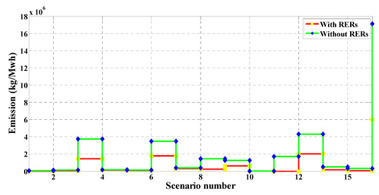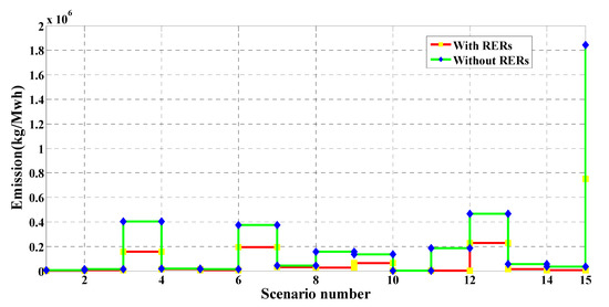 where represents the total expected emission, and f2 is the emission reduction from generation units. Grid NOx, SO2, and CO2 emission rates were set to 5.06 kg/MWh, 11.6 kg/MWh, and 2031 kg/MWh respectively [20].