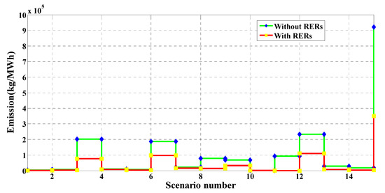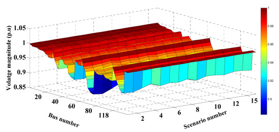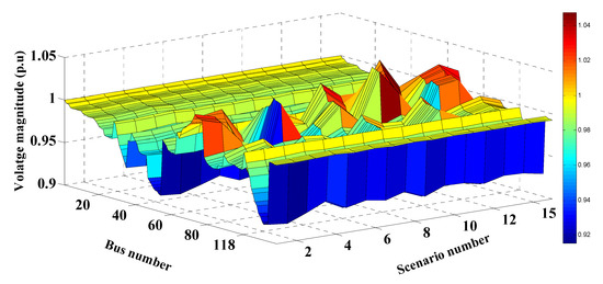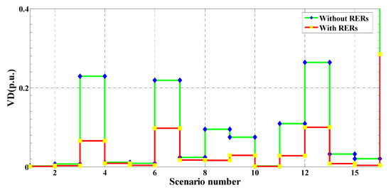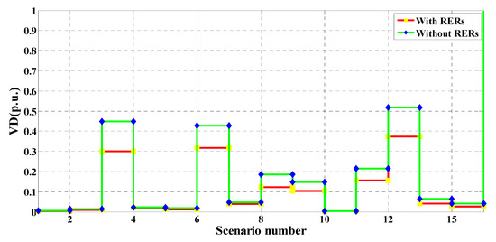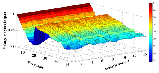 In this case study, MRFO was employed to identify the optimal RER locations and ratings in the 51-bus system shown in Figure 6. Without RERs, the expected cost, emissions, voltage deviation, and the expected voltage stability index were 176.0419 USD/h, 3,754,900 kg/MWh, 2.1514 p.u., and 41.9992 p.u., respectively. In the case of the optimal insertion of WT and solar PV-based DGs, these respective values improved to 113.4299 USD/h, 1,504,600 kg/MWh, 0.6678 p.u., and 47.6629 p.u. with a percentage improvement of 35.57%, 59.92%, 68.95%, and 11.88%, in each respective parameter. The optimal sites of the PV units and the WT were buses 43 and 9, respectively. The optimum sizes of these DGs were found to be 574.58 kW and 1884.61 kW, respectively. Table 8 shows the PV and WT output powers, as well as the expected values for each studied scenario. Similar to the above case study, the values in Table 8 changed for each scenario due to the changes in RER generation and the variation of the load demand. It can be seen that the highest values of the expected cost, emissions, and voltage deviation occurred in scenario number 15, where no solar-based power is generated. The values of the cost, emissions, VDs and the VSIs for each scenario with and without the integration of RERs are shown in Figure 14, Figure 15, Figure 16 and Figure 17, respectively. These figures reveal that the cost, emissions, and VDs were reduced significantly in each scenario with the inclusion of RERs, along with a considerable enhancement in the VSI. In addition, Figure 18 and Figure 19 depict the voltage profiles of the 51-bus system for each situation. It is obvious that the integration of RERs at a proper location and with an optimum sizing can improve the voltage profile at each bus for all scenarios. Table 9 shows the statistical results of the objective function calculated using different optimization algorithms. Results in Table 9 attest to the superiority of the proposed MRFO technique over all other optimization methods, namely, PSO, WOA, SCA, and ALO.