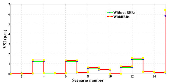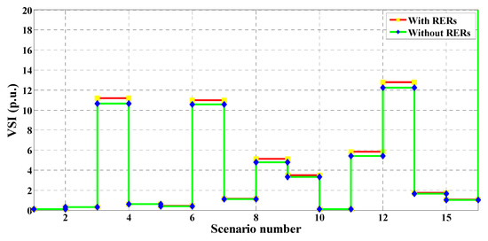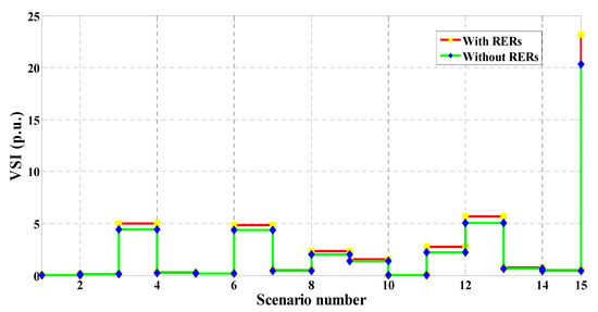 - The cost, emissions, and VDs are significantly reduced with the inclusion of RERs, while the VSI is significantly enhanced.