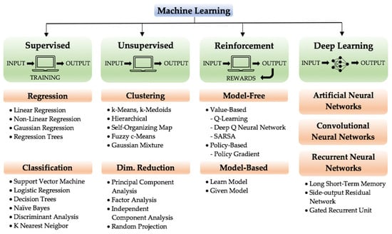 Machine learning can be defined as computer models and algorithms that are able to automatically learn and adapt from data and experience without explicit instructions or human intervention [41,42,43,44,45,46,47,48]. As can be seen in Figure 5, machine learning methods can be classified into four categories: supervised learning, unsupervised learning deep learning, and reinforcement learning— the first three being more common.