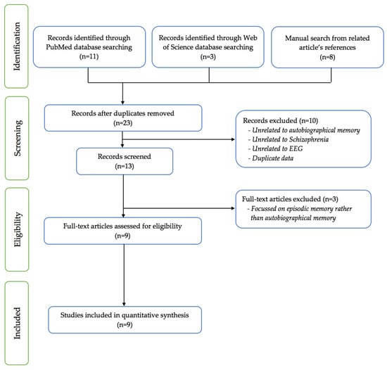 Recent advances in signal processing and machine learning, as well as improvements in the ability to collect, store, and process massive amounts of data, have provided significant progress and new insights into neurological computerized analysis. EEG signals are intrinsically complex with non-Gaussian, non-stationary, and often non-linear natures. Therefore, the help of both signal processing and machine learning offers the possibility to obtain objective clinical diseases diagnoses, predictions, and the monitoring of treatment (in addition to the subjective interpretation of EEG recordings). Significant uses of EEGs in neural studies have been applied to a variety of brain disorders, i.e., Parkinson disease, epilepsy, tremor, strokes, concussions, bipolar disorder, schizophrenia, depression, and sleep disorders, to name a few, or they have simply been applied to brain monitoring or brain rhythms detection. Concerning autobiographical memory deficits in schizophrenia evaluated through EEG, in order to rigorously identify previous publications to date a preferred reporting items for systematic reviews and meta-analyses (PRISMA) analysis has been performed and is shown in Figure 6.