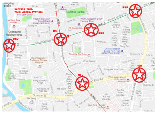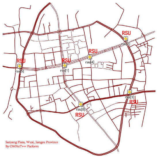 In order to verify our model, the data from a real scenario with multi-user and multi-server is considered to display work conditions. Formally, we get the map of Sanyang Plaza in Wuxi, Jiangsu province, China from Open Street Map (OSM), as shown in Figure 2. The messages from each vehicle can be received by any number of RSU (even no RSU). In a nutshell, we make some modifications with “JOSM” software. The corresponding simulation scenario is built in Figure 3. Some parameters also need to be changed, where we set vehicle numbers to 120, and RSU numbers to 6, and channel bandwidth to 20 MHz, and size of input data to 200 KB, which benefits to task offloading. The OMNeT++ supports to export resulting data to CSV format, suitable for importing into Python’s Pandas or R language. We choose Python’s Pandas to process data and achieve task offloading strategy scheduling.
