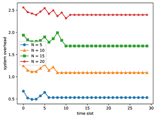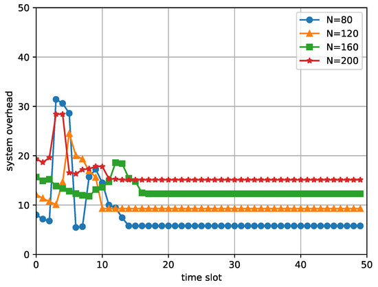 The local computing capability of each vehicle is defined as , , or 1. The SUMO builds a network simulation model and generates network file, traffic file and poly file. This model is imported to the OMNeT++ and the vehicles are to instantiate mobile network nodes. RSU begins to operate task offloading scheduling after receiving the messages of all vehicles. The offloading vehicle numbers of each RSU increase initially due to free channel, and then settle out during a period of jitter. Specifically, the system overhead of each time slot is verified in Figure 4 and Figure 5 when and , respectively. From the Figure 4, it is obvious that the system overhead reduces about 24.19% compared to the initial state when it maintains stabilize after four times of update operation. When the multiple RSUs are deployed in networks, the system overhead fluctuates quite a bit initially and reaches a steady state finally, which can reduce about 33.76% compared to the initial state from the Figure 5. It shows that network resource can be used effectively by task offloading scheme.