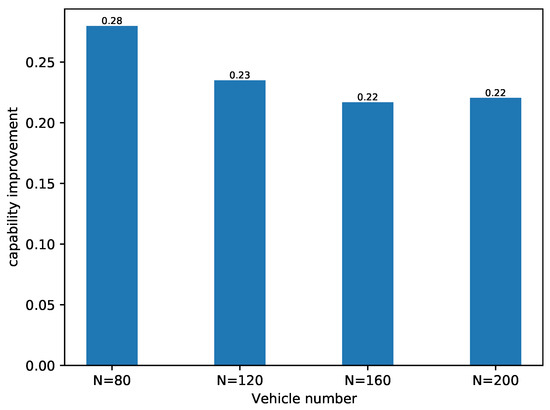 In addition, the system capacity of the vehicular networks is improved when the proposed offloading scheme is adopted in Figure 6. With the increase in the number of vehicles, the proposed task offloading scheme can enhance the vehicles to access channel freely and to facilitate communication through V2I and V2V pattern.