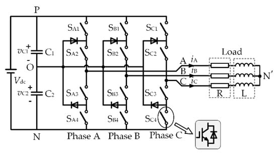 Compared with two-level inverters, NPC three-level inverters have advantages of lower output harmonics distortion and lower dv/dt of the power device. Thus, it is widely used in medium-voltage high-power traction applications, such as locomotive traction and ship propulsion [1,2,3].