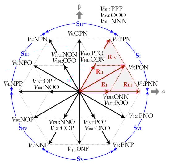 The space vector diagram for the three-level inverter is shown in Figure 2, with 33 = 27 basic vectors. According to the amplitude, the basic vectors can be divided into four categories: large vector V1–V6, medium vector V7–V12, small vector V13U–V18U, V13L–V18L and zero vector V0U, V0M, V0L. As can be seen, there are two small vectors that occupy the same position, and they are defined as redundant vectors. The definition is also suitable for zero vectors.