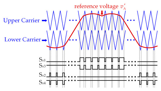For conventional CBPWM of the three-level inverter, the pulse signal for each power device is produced by the comparison of the carriers and the reference voltage vx, (x ∈ {A, B, C}). The reference voltages of the three phases are defined as: