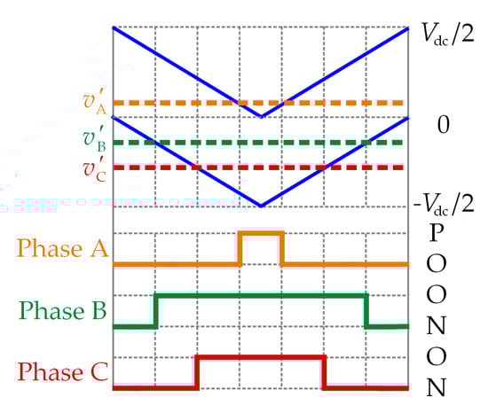 The three-phase reference voltages v″x in a unit fundamental period are shown in Figure 6. The switching states of the three phases are clamped to the positive bus, the negative bus and the neutral point of the DC-link alternatively, and the discontinuous modulation is realized.
