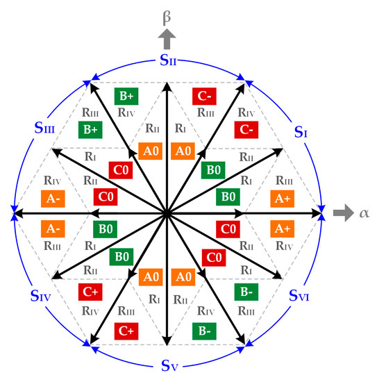 From the aforementioned analysis, phase B is clamped to the switching state O in regions RI and RII. It can be defined as clamping state B0. Similarly, phase A is clamped to the switching state P in region RIII, and it can be defined as clamping state A+; phase C is clamped to the switching state N in region RIV, and it can be defined as clamping state C−. The clamping state of other sectors can be obtained by replacing the vector in SI by the corresponding vector that occupies the identical position in a given sector, as shown in Figure 5.