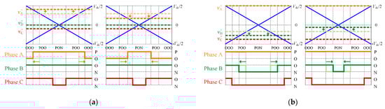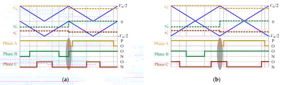 As can be seen, the switching sequence is PNN–PON–POO–PON–PNN in region RIII, and the amplitude of CMV is Vdc/6. The switching sequence is OON–PON→POO–PON–OON in region RI, and the amplitude of CMV is also Vdc/6. Comparing Figure 7a with Figure 4, the amplitude of CMV is reduced from Vdc/3 to Vdc/6 by the injection of vZ2. Moreover, the number of switches in each carrier period is reduced from 3 to 2. However, it is worth mentioning that there are extra switches during the transition of two adjacent regions. As shown in Figure 7a, the last switching state of region RIII is PNN, and the first switching state of region RI is OON. The switching states of phase A and phase B are both changed so that the switching loss is increased. To solve the above issue, the two triangle carriers need to be changed from phase disposition to phase opposition disposition, as shown in Figure 7b. After that, the switching sequence in region RIII becomes POO–PON–PNN–PON–POO, and the switching sequence in region RI becomes OOO–POO–PON–POO–OOO. The amplitude of CMV is still Vdc/6. Meanwhile, only the switching state of phase A is changed during the transition of two adjacent regions.