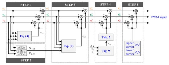 - STEP 5: the pulse signal of each power switch is generated by the comparison of the reference voltage v*x and the carriers.